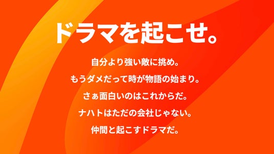 ナハトは、ミッションに「ドラマを起こせ。」を掲げ、マーケティングを武器に事業成長を実現する、事業創造マーケティング企業です。広告やSNS支援にとどまらず、D2C、店舗運営、二次流通、コンサルティングなど、領域を超えて自ら事業を作り伸ばしてきた実践知をもとに、認知・獲得にとどまらず、戦略やプロダクトにまで踏み込み、非連続な成長へと導きます。すべては、仲間と勝ち続けるために。2040年、3000人、2000億の企業体を目指します。詳しくは、公式サイト(https://nahato.co.jp/)をご覧ください。