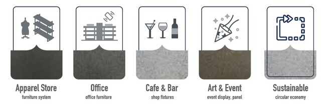 ファッションとインテリアの世界をつなぐ新たな循環モデル。廃棄衣類繊維のアップサイクルとサーキュラーエコノミーをデザインし、イベントやオフィス等のさまざまな空間の内装やディズプレイ什器、家具へと生まれ変わる、クリエイティブな世界観を生み出します。