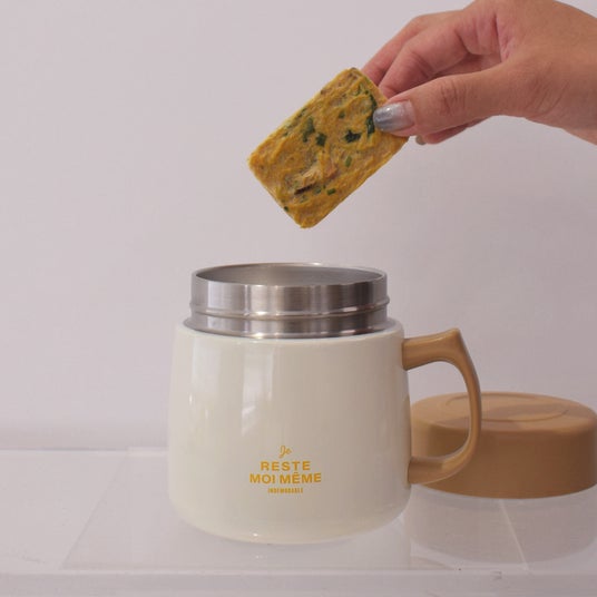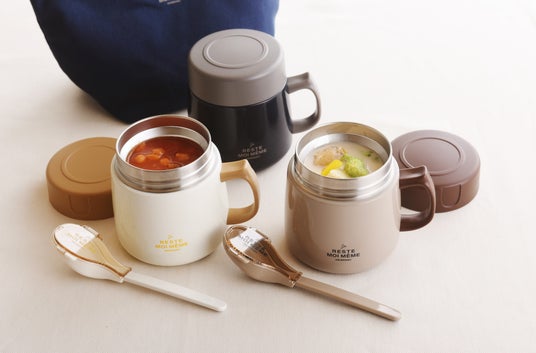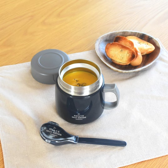 - 本体はステンレスの2層構造。味噌汁、スープなどを温かいまま持ち運ぶことができます。また保冷機能としても〇。冷製スープなども冷たさを保ちます。湯量・水量の目安が分かる目盛り付き。インスタントスープを作るときに便利です。本体のフチの端はなめらかになっています。そのまま飲む際にも優しい口当たりです。