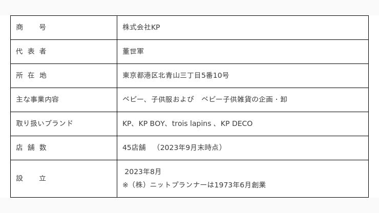株式会社 W&D インベストメントデザイン(本社:東京都港区、代表取締役:田口敬二郎、栗本興治、以下「W&DiD」という。)は、株式会社ワールド(本社:兵庫県神戸市、代表取締役 社長執行役員:鈴木信輝)の100%子会社である株式会社ワールドインベストメントネットワーク、株式会社ナルミヤ・インターナショナル(本社:東京都港区、代表取締役執行役員社長:國京紘宇、以下「ナルミヤ」という。)および株式会社日本政策投資銀行(本社:東京都千代田区、代表取締役社長:地下誠二、以下「DBJ」という。)に対してトラッキングストック(注1)を割り当てて調達した資金をもとに設立した株式会社KP(本社:東京都港区、代表取締役社長:董世軍、以下「新KP」という。)を通じ、ベビー・子供服等企画・卸売事業を営む株式会社ニットプランナーから主要事業を譲り受けました。