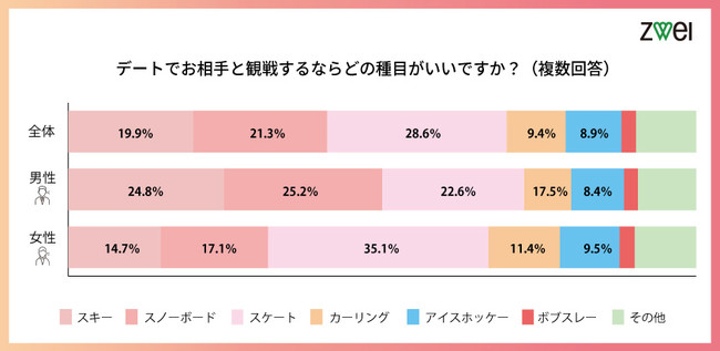 ・デートで観戦したいウィンタースポーツは、男性が「スノーボード」、女性は「スケート」という結果に。