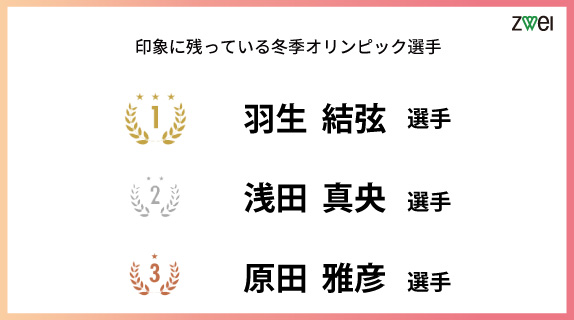 2大会連続で金メダルを獲得した「羽生結弦」選手が第1位に選ばれた。第2位は五輪女子史上初めてトリプルアクセルを成功させた「浅田真央」さん、第3位は長野オリンピックで見事なジャンプを披露した団体ラージヒル金メダリストの「原田雅彦」さんという結果になった。