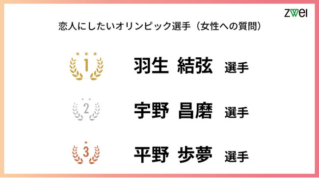 ・恋人にしたい男性アスリート第1位は「羽生結弦」選手、女性アスリート第1位は「高梨沙羅」選手という結果に。