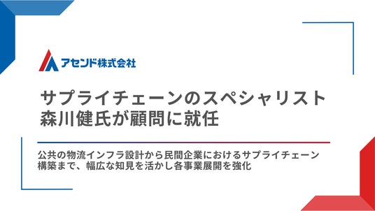物流DXを推進するアセンド株式会社(本社:東京都新宿区、代表取締役:日下瑞貴、以下「当社」)は、2026年4月付で、株式会社野村総合研究所にて長年、サプライチェーンやロジスティクスに関わるコンサルティングに従事してきた森川健(もりかわ たけし)氏を、顧問としてお迎えしたことをお知らせいたします。森川氏の知見を活かし、特に当社が新しく展開する、サプライチェーン最適化に向けた戦略設計と物流手配を包括的に受託する4PL(フォース・パーティ・ロジスティクス)事業をはじめとした各事業の強化を図ってまいります。