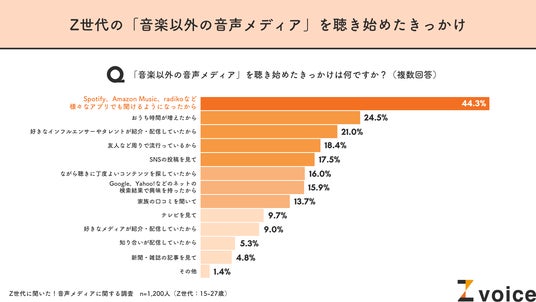 続いて、音楽以外の音声メディアを聴き始めたきっかけを聞いたところ、「Spotify、Amazon Music、radikoなど、さまざまなアプリでも聴けるようになったから」がもっとも多く、44.3%にも昇りました。