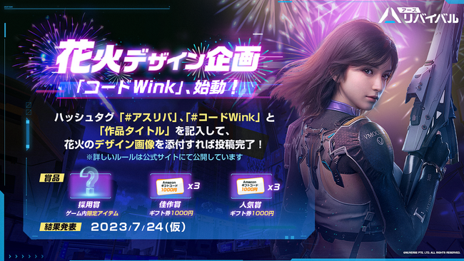 内容:ゲーム内で実装するための花火のデザインコンテストを実施。ハッシュタグ「#アスリバ」「#コードWink」と一緒に、花火のデザイン画像と作品タイトルを投稿すると応募完了。採用賞2名、優秀賞4名、人気賞4名が選ばれ、採用賞に選ばれた方にはゲーム内限定アイテムのほか、後日ゲーム内でデザインされた花火を実装予定です。どんなメッセージを仲間へ発信したいですか?サバイバーたちが通信で使う大切な手段「花火」を思いのままにデザインしてください!