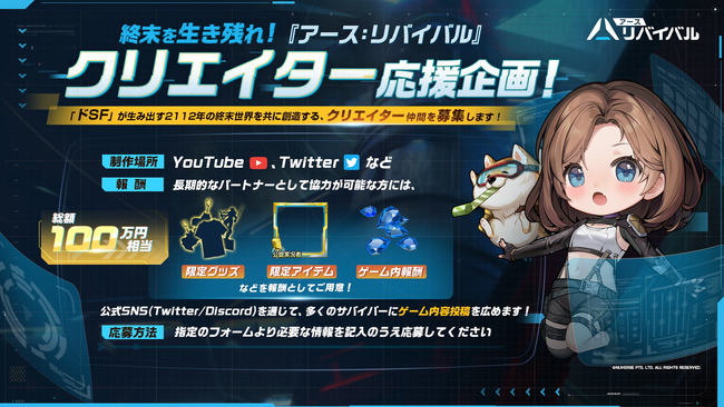 内容:アスリバを一緒に盛り上げるクリエイターを募集いたします。YouTubeやTwitterなどでアスリバ関連コンテンツを作成し、長期的なパートナーとして協力が可能な方には、限定グッズ、限定アイテム、ゲーム内報酬などをプレゼント。指定のフォームより必要な情報を記入すれば応募完了。応募者の方には後日詳しいルールをお伝えいたします。