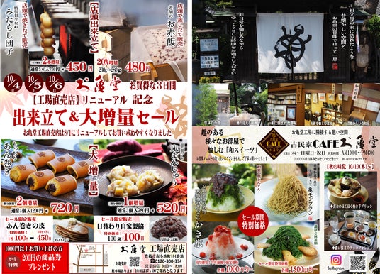 愛知県三河地域で70年以上の永きにわたりご愛顧頂いている老舗和菓子店、株式会社お亀堂(本社所在地:愛知県豊橋市 代表取締役:森貴比古)は、10月4日(金)~10月6日(日)のお亀堂工場直売店のリニューアルセールを行います。出来立て&大増量セールになります。その他セール期間限定で奉仕品もりだくさんになっています。