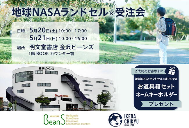オリジナルランドセル「地球NASAランドセル(R)」の企画・販売を行う池田地球株式会社(本店:東京都港区:代表取締役 村尾光一)は、5月20日(土)と21日(日)の2日間限定で、明文堂書店 金沢ビーンズ 1階BOOKカウンター前にて「地球NASAランドセル(R)受注会」を開催いたします。