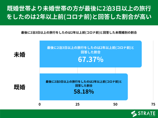 最後に2泊3日以上の旅行をしたのは2年以上前(コロナ前)と回答した割合を未既婚別でみてみますと、未婚者は67.37%、既婚者は58.18%という結果になりました。
