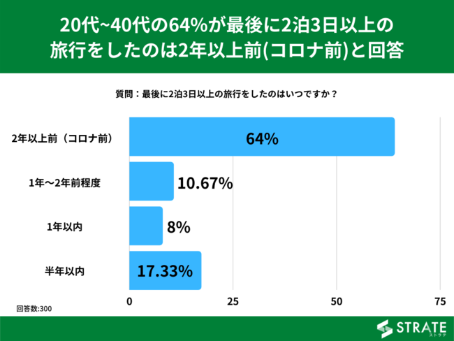 20代~40代の男女を対象とした「最後に2泊3日以上の旅行をしたのはいつですか?」というアンケートで最も多かった回答は「2年以上前(コロナ前)」で64%でした。