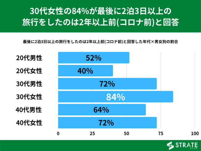 最後に2泊3日以上の旅行をしたのは2年以上前(コロナ前)と回答した割合を年代×男女別でみてみますと、30代女性が最も多く84%、次いで30代男性と40代女性が同率で72%、20代女性は40%にとどまりました。