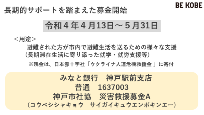 ロシアによるウクライナへの侵攻により、国外への避難を余儀なくされた方々がおられます。神戸市社会福祉協議会では、この度ウクライナから神戸市内に避難して来られた方々への支援を目的とした募金を下記の通り受け付けます。当募金には、本会が株式会社みなと銀行との間で交わした協定に基づくご協力により、一部取扱いについて振込手数料が免除されます。