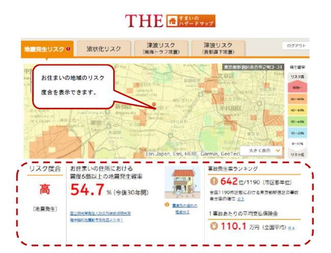お客さまのお住まいの住所における地震発生確率や洪水時想定浸水深などリスク度合をハザードマップ上に表示できます。損保ジャパンの保険金支払実績等データを表示できますので、災害の程度がイメージしやすく防災につなげることができます。