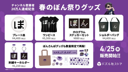 株式会社ドズル(以下、ドズル社 本社:東京都品川区、代表取締役社長:ドズル(YouTubeクリエイター))は、ゲーム実況グループ「ドズル社」のメンバー ぼんじゅうるのYouTubeチャンネル登録者20万人達成を記念した新グッズを発売する『春のぼん祭り』を、2024年4月25日(木)よりドズル社ストアにて開催します。