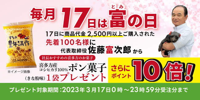 株式会社河京(本社:福島県喜多方市、代表取締役:佐藤富次郎)は、毎月17日を『富の日』とし、2023年3月17日(金)に公式オンラインショップにてご購入いただいたお客様先着100名様にプレゼントキャンペーンを実施します。