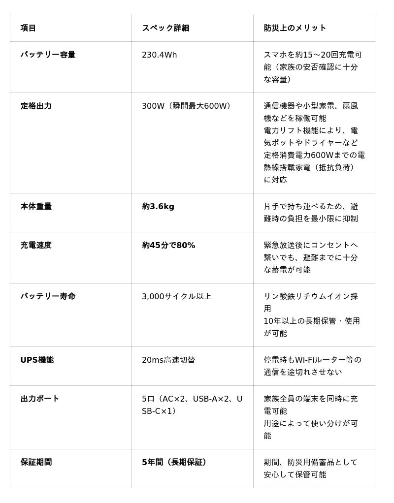 2.誰でも持ち出せる機動性: 3.6kgという軽量ボディを活かし、避難時に「スマホと一緒に真っ先に持ち出すべき防災グッズ」として紹介します。