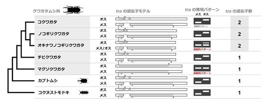 静岡大学理学部の後藤寛貴助教らの研究グループは,「メス化遺伝子」として知られる transformer (tra)の数がクワガタムシ科において増えていることを発見し,さらに一部の種ではオスでも発現していることを明らかにしました.
