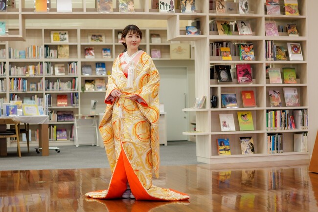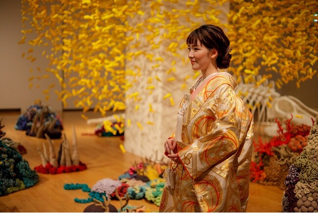 衣装は日本の伝統的な白無垢や色打掛で。幸せな新郎新婦の後ろには、現在、現代タイを代表する画家、パンヤー・ウィチンタナサーンの巨大な作品「魂の旅 The Journey of Soul」が展示されています。挙式後は、「福岡アジア美術館」の展示ギャラリー(常設スペース)でのフォトセッションを行うことができます。