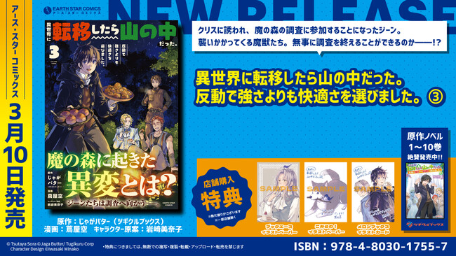 ツギクルブックスで刊行中のノベルが原作で、現在コミック アース・スターで掲載中の人気作品『異世界に転移したら山の中だった。反動で強さよりも快適さを選びました。』第3巻を3月10日(金)に発売いたします。