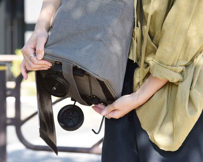 キャスターは折り畳み式。荷物が多い時はキャスターを出してカートに、少ない時はキャスターを畳んでトートバッグとして使用も可能です。