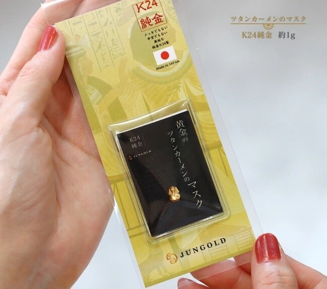 ツタンカーメンのマスクは純金を使用して作られていると言われていますが、表に見えてる顔の部分は純度が高くK22.5(約94%)、サイドはK18.5(約77%)なのだそうです。当時はそれが最高純度だったようですが、今や純金と呼ばれるものはK24(99.9%)です。今回のJUNGOLDが作る「黄金のツタンカーメンのマスク」は、純度99.9%の“K24”純金製となっております。