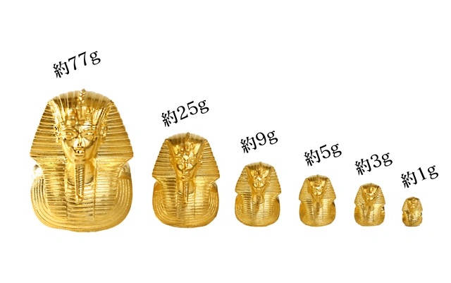 古代エジプトの富と技術を結集した美しい黄金のマスクを、【純度99.9%の金】純金で再現しました。約1gの極小サイズから、77gまでの6サイズ展開です。