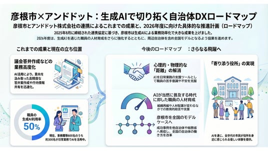 AXプロデュース事業を展開するアンドドット株式会社(本社:東京都渋谷区、代表取締役:茨木 雄太、以下:アンドドット)は、2026年4月10日(金)、滋賀県彦根市と「AI活用による地方自治体業務の高度化に関する連携協定式」を実施したことをお知らせいたします。本協定式では、2025年8月の連携協定締結以降の成果報告と、2026年度に向けた具体的な推進ロードマップの発表と議論を行いました。