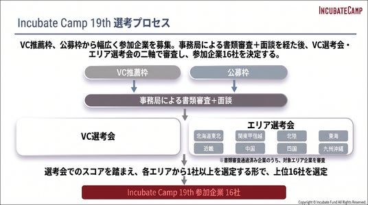 Incubate Camp 19thでは、新たな取り組みとして「VC選考会」と「エリア選考会」の2つの選考を実施します。