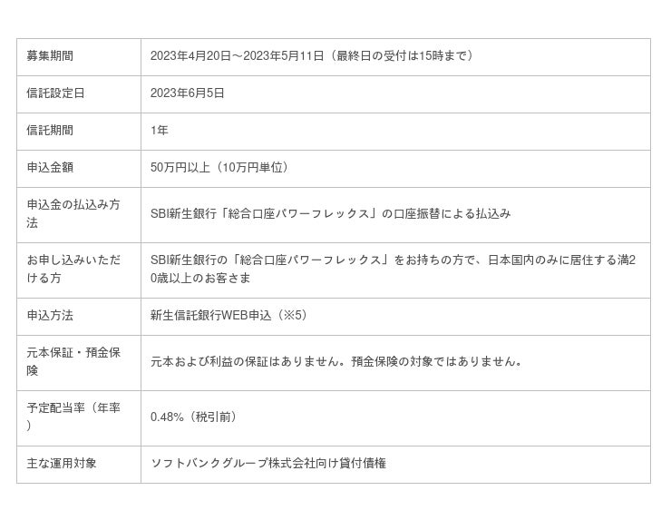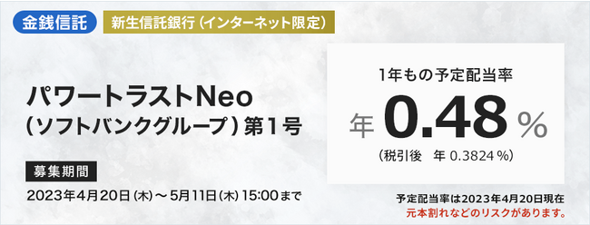 「パワートラストNeo」は、新生信託銀行が選定する上場企業1社向けの貸付債権等で運用するもので、本商品における運用の対象はソフトバンクグループ株式会社向けの貸付債権等となっています。