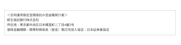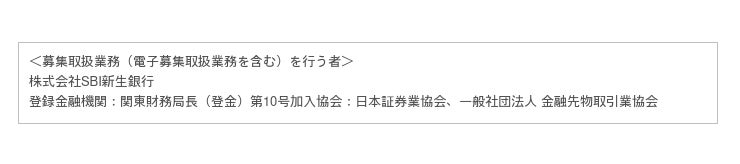 (※5) お申し込みにあたってはSBI新生銀行又は新生信託銀行が提供する契約締結前交付書面等(商品説明書、募集要項及び 信託約款)を必ずご確認いただき、本商品のリスクや手数料・費用等につき十分ご理解のうえ、お客さまご自身の判断と責任で お申し込みください。なお、契約締結前交付書面等は、SBI新生銀行の店頭で入手できるほか、SBI新生銀行のWEBサイトからご確認いただけます。