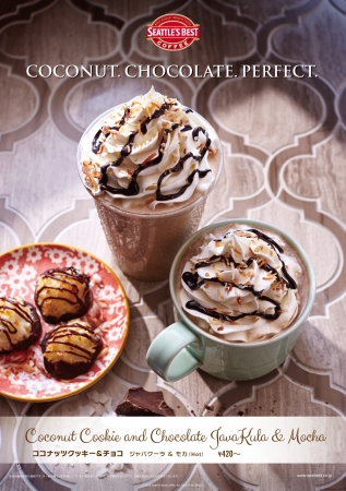 チョコレートをかけたココナッツクッキーをイメージしたデザート感覚のドリンクを、フローズンコーヒードリンクとホットモカでご用意しました。