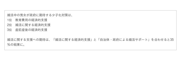 1位「教育費用の経済的支援」 2位「産前産後の経済的支援」 3位「婚活に関する経済的支援」となりました。