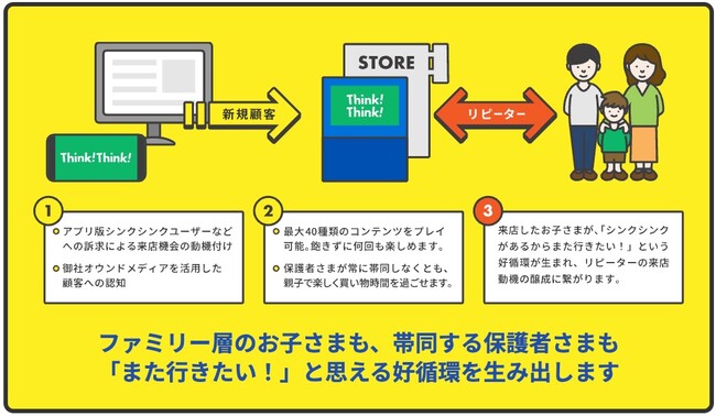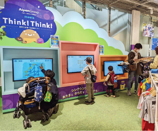 本サービスのベースとなっている知育アプリ「シンクシンク」は、その教育的効果が既に実証されており、保護者の方は安心してお子さまを遊ばせることができます。家族のお買い物時間や待ち時間が「学びの時間」になることで、お客さまの満足度向上にもつながります。