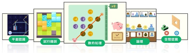 本サービスは、思考力が育つ土台となる5分野(空間認知・平面認知・試行錯誤・論理・数的処理)を網羅的に楽しみながら学べる知育アプリ「シンクシンク」の中から、お子さまに大人気の問題を厳選して収録しています。