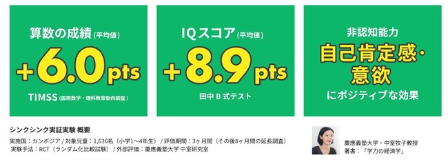 また、カンボジアにて、同国政府の全面協力のもと、国際協力機構(JICA)、慶應義塾大学中室牧子研究室と行った実証実験では、シンクシンクが学力・IQに有意な効果を及ぼすことが確認されています。(*2)(*3)