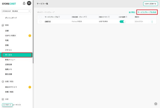 1.左ツールバーから「サービス」を選択、「サービスグループを作成」をクリックします。
