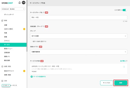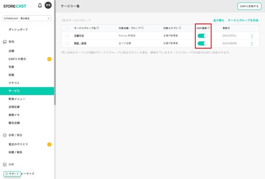 4.デフォルトでは、登録した内容が自動でGoogle ビジネス プロフィールに反映されるよう「GBP連携」がオンになっています。サービス開始前やキャンペーンなどの掲載期間を指定したい場合は、「GBP連携」をオフにして非掲載とすることも可能です。