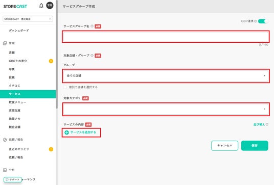 2.「サービスグループ名」を入力し、「対象店舗・グループ」「対象カテゴリ」を選択します。