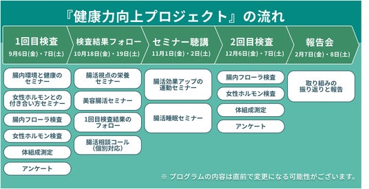 本プロジェクトは、女性の健康課題改善に向けた取り組みとして、2024年9月6日(金)から2025年2月8日(土)の期間で実施予定です。期間内で「腸内フローラ検査」「女性ホルモン検査」「体組成測定」を計2回実施いたします。1回目の検査後には、腸活や女性ホルモンとの付き合い方などに関するセミナーの実施や、管理栄養士への相談(電話)などのサポートを通じて、市民の皆さまのヘルスリテラシーの向上に貢献してまいります。また、本プロジェクトは共同事業社として、キリンホールディングス株式会社(本社:東京都中野区、代表取締役社長 COO 南方 健志、以下キリン)にもご協力をいただきます。ご参加の皆さまには、プログラム中にキリンが提供する健康食品を配布し、ご利用いただきます。