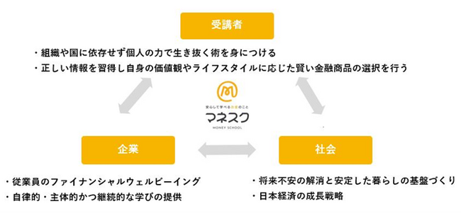 マネスクを通じて、従業員の皆さまのお金に対する価値観をアップデートし、「仕事」と「資産運用」の両輪で人生設計をしていくための知識と能力を提供することで、「生きる力」を育んでいただく場を提供します。
