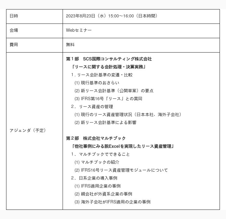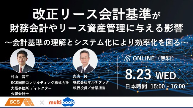 海外拠点を持つ企業の経営管理を支援するクラウドERPサービス「multibook(マルチブック)」を提供する株式会社マルチブック(東京都品川区、代表取締役CEO:渡部 学)は、SCS国際コンサルティング株式会社(東京都港区、代表:牧 辰人)と共同で、新リース会計基準(公開草案)の内容を踏まえつつ、リースに関する会計処理・決算実務およびリース資産管理システムを活用した効率的なリース資産管理について解説いたします。