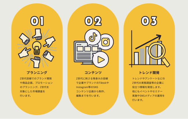 座談会やアンケートなどの実態調査によりZ世代のトレンドや統計など企業に役立つ情報を発信します。他にもイベントやセミナー実施やSNSメディアの運用を行います。