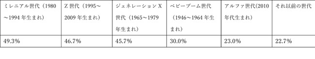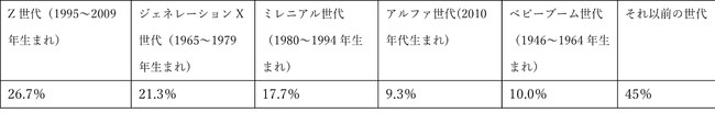 ミレニアル世代(1980~1994年生まれ)、Z世代(1995~2009年生まれ)、アルファ世代(2010年代生まれ)