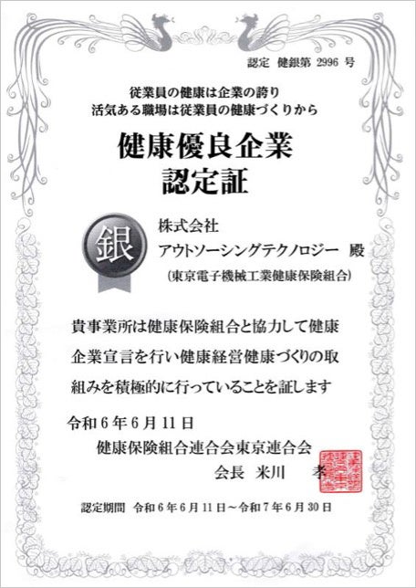 株式会社アウトソーシングテクノロジー(本社:東京都千代田区、代表取締役社長:笠井 嘉明、以下OSTech)は、健康保険組合連合会東京連合会に「健康企業宣言※」を行い、健康経営に向けた職場の健康づくりや、環境整備などの積極的な取り組みが評価され、健康優良企業「銀の認定」(健銀第2996号)を取得しました。