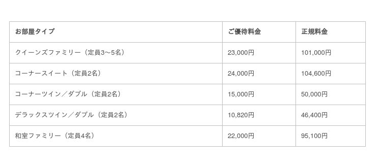 ▼ご優待料金(1泊1室・室料のみ/税金・サービス料込)