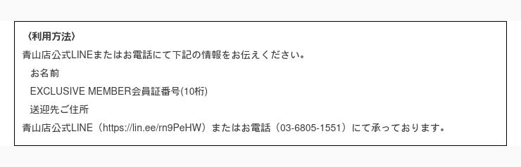 東京駅・品川駅も対象となりますので全国各地の遠方からお越しになられる際もご利用いただくことが可能となります。 事前予約も承っておりますので、詳細は青山店のスタッフまでお問い合わせください。