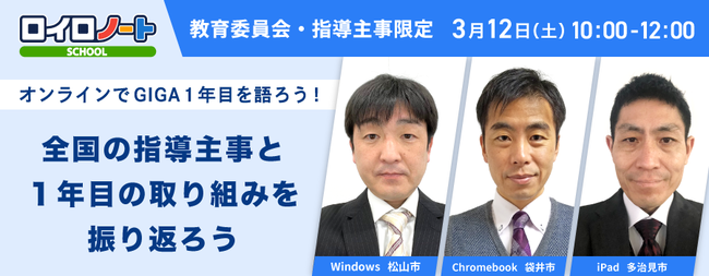 そこで、私たちLoiLoは3月12日(土)教育委員会・指導主事を対象に、GIGA端末の活用推進の取り組みについて学べるオンライン勉強会を開催します。全市でGIGA端末を先進的に活用している松山市(Windows)、袋井市、(Chromebook)、多治見市(iPad)の指導主事から、各校で実際に行われたICT活用推進のための取り組みについてお話しいただきます。