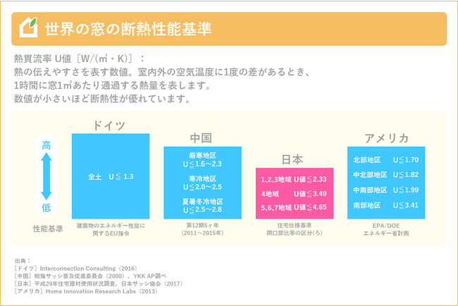 熱の伝えやすさを表す数値、熱貫流率 U値は数値が小さいほど断熱性が優れています。数値を比べるとドイツ全土がU=1.3W/平方メートル Kに対し、日本ではU=4.65W/平方メートル K(概ね仙台以南の地域)と大きな差が。地域ごとに違いはあるものの、日本で広く採用されているサッシの性能の低さがうかがえます。