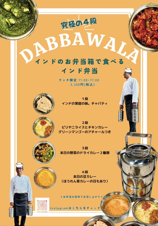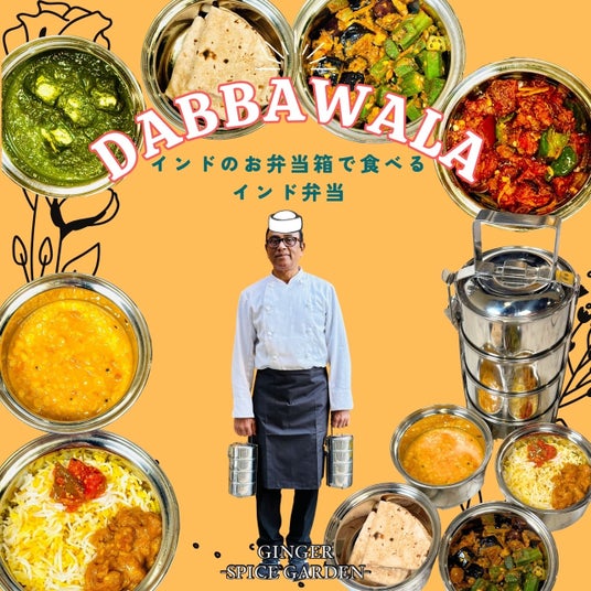 インドの食文化体験をプロの味で楽しめる!GINGERのインド弁当GINGERでは、伝統的な食文化であるダッバーワラを楽しめるインド弁当をランチタイム(11:00~17:00)限定でご提供いたします。インドのステンレス製の4段の弁当箱「ダッバー」に、ビリヤニや旬の野菜のドライカレーなど、プロが作った自慢の料理を入れて、店舗のスタッフが目の前にお持ちします。店内で、ダッバーワラというインドの食文化体験を気軽に楽しめる新しい体験型のメニューサービスです。